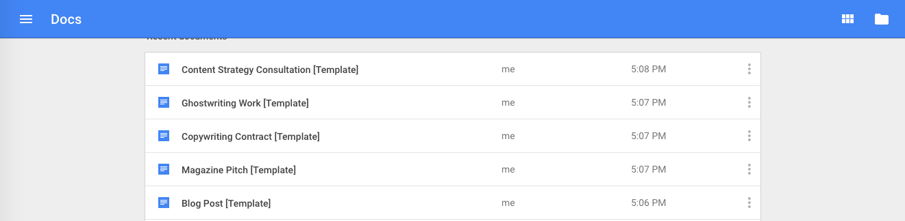 Finally, apply a standardized naming system for templates. I add [Template] to the end of the filename for each of my templates, such every bit "Blog Post [Template]" or "Project Calendar [Template]". To become started on a certificate just search for "[Template]" in whatever tool I'thousand using. Just choice a way to identify your document templates, and stick to it.